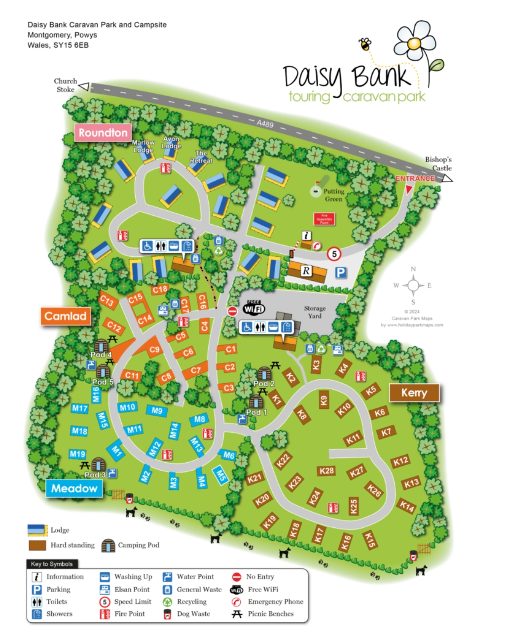 An adult-only caravan park on the Wales border with fantastic views of the Shropshire hills. It's the ideal spot for exploring mid-Wales, 'the Marches' towns and the rest of Shropshire. 65 pitches are spread across four areas of the site, each with their own features and views (Camlad, Meadow, Kerry and Roundton). Ideal for caravans and motorhomes, all pitches are fully serviced hardstanding with 16 amp electric hook up, fresh water and waste water drainage. Some also have TV hook up. For glampers, four camping pods offer shelter and comfort. For extra insulation, they include a layer of sheep's wool within the walls that will keep you toasty. They feature double-glazing, lockable French doors and a window. Guests are required to bring their own bedding and mattress. Daisy Bank is also a member of Tranquil Parks.