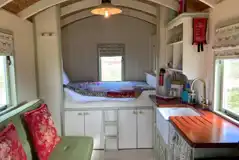 Traditional heated shepherd's hut with a double and sofa bed. A kitchen area equipped with a hob, fridge, tea and coffee facilities and all the crockery and utensils you'll need. Outside is a seating area. Shared facilities nearby.