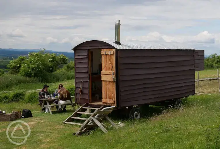 The Orchard hut Sleeps up to three with a small double bed and futon for the floor, gas rings, crockery, cutlery and electric sockets. There is also an outside seating area with a firepit.