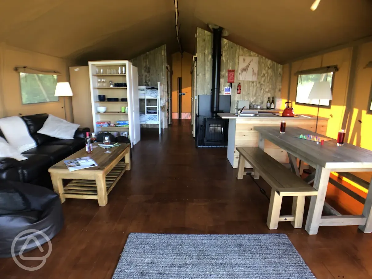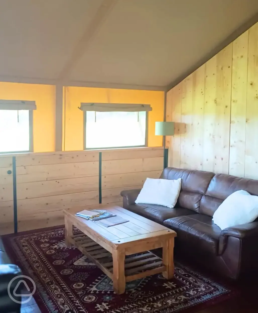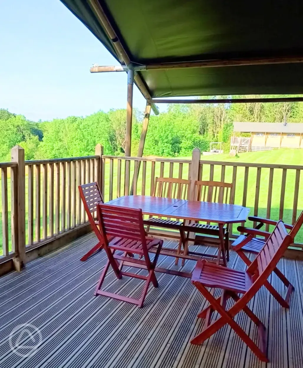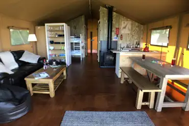 Two large safari tents sleeping up to six people. Each with comfy beds, bathroom, kitchen and dining room. There is a large sofa where you can relax. Outside, there's a raised decking and patio area.