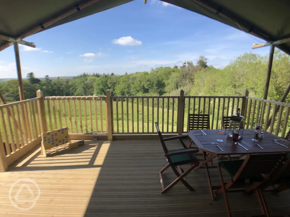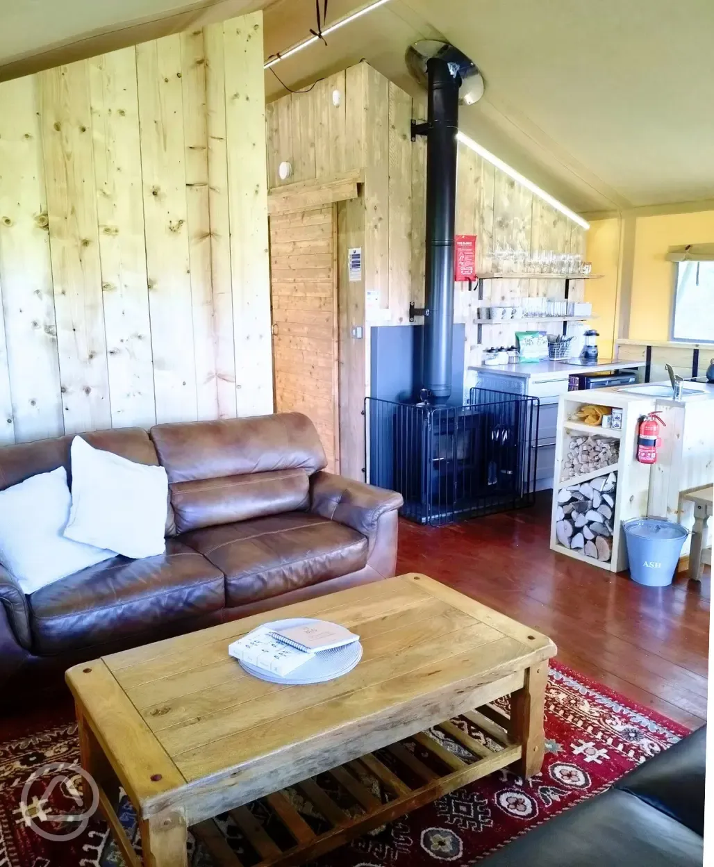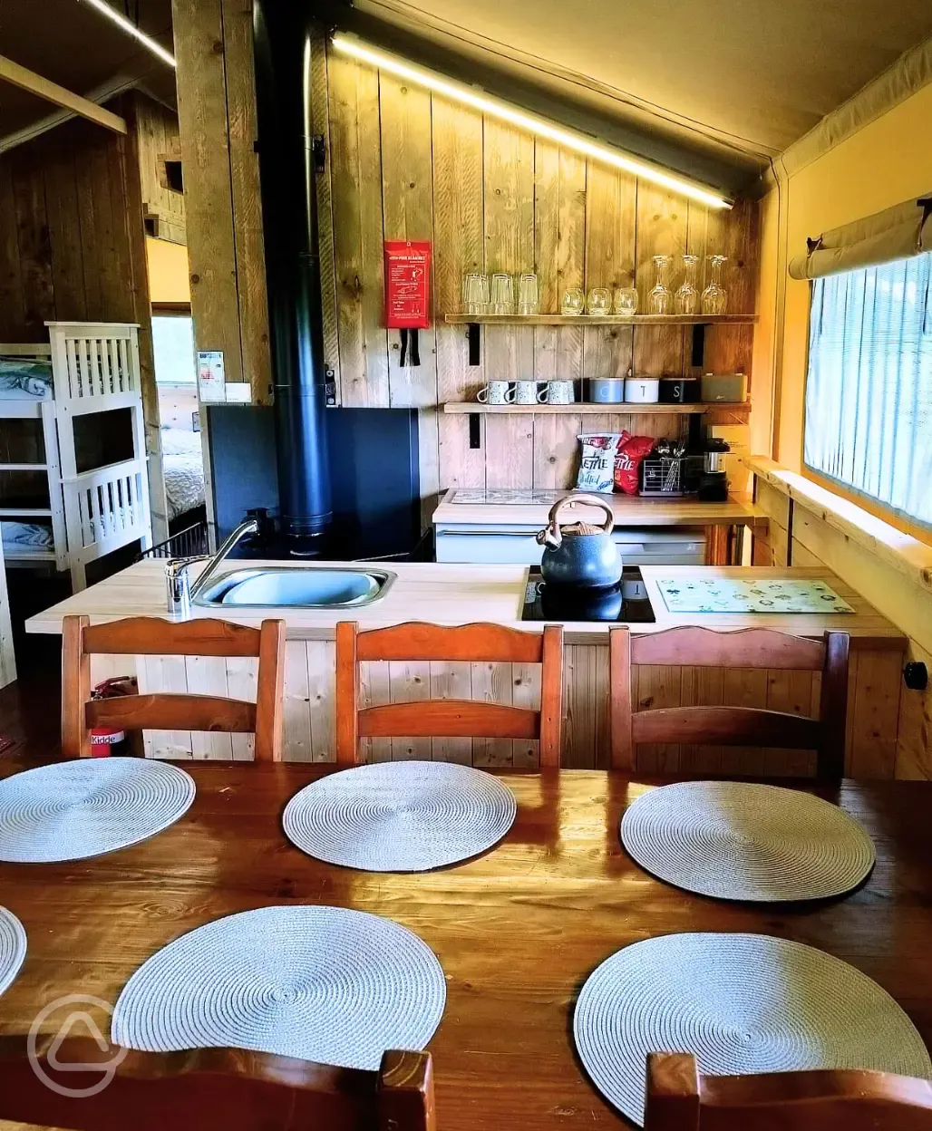 Two large safari tents sleeping up to six people. Each with comfy beds, bathroom, kitchen and dining room. There is a large sofa where you can relax. Outside, there's a raised decking and patio area.