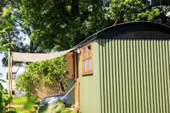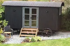 A cosy shepherd's hut made by a local craftsman, featuring a double bed, double mezzanine bed with access via a ladder and a well-equipped kitchen. Outside is an undercover patio area and seating. Please bring your own bedding and pillow. Dog welcome.