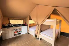 Safari tents including beds, cooking stove, fridge and washing up sink. Please bring all your camping equipment, towels and bedding.