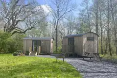 Shepherd's huts with a double bed, a log burner and a small fridge. Outdoor picnic table and fire pit. Bring all your camping equipment.
