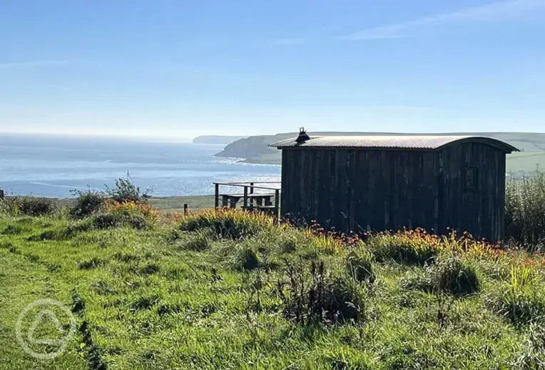 Includes a raised, large double bed with bed linen and blankets, a kitchen area with a wood burning stove, a stainless-steel cooktop, and cooking equipment. Outside, there is a fire pit and BBQ grill with sea views.