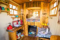 Includes a king size bed, a roll out mattress for small children, a wood burning stove with cooking equipment, and an outdoor fire pit with a BBQ grill. Shared facilities are nearby. Bedding is available for a small charge.