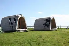Wooden pods sleeping three adults (or four with a very snug fit). Light, heater, electric sockets, kettle, cups and saucers, tea and coffee, hot water bottles and chairs. Bedding is not included but can be hired. Pets welcome. Shared facilities nearby.