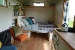 Shepherd's hut with a dining area that converts into a double bed, a shower, sink and a toilet. There is a sink, fridge, kettle, toaster, induction hob and log burner. There is a private wood fired hot tub. Bedding is provided when booking individually.