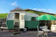A 1970's retro caravan with a dining area that converts into a double bed. The kitchenette has a gas hob and grill, microwave, compact fridge, heater and cold water supply only. Bedding is provided when booking individually. Shared facilities are nearby.