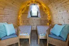 Pods with two single beds that can be pushed together to form a double, the camping pods also have a small porch, electric for phone charging and a private fire pit. Bedding is not provided.