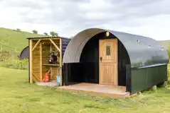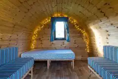 A pod containing one double bed, two single beds and electric for phone charging and lighting. There's a protected porch, outdoor chairs, a picnic bench and a fire pit. Bedding is not provided.