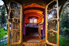 Wooden shepherd's hut furnished with wood burning stove, kitchenette and double bed.