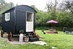 Oak is a wooden shepherd's hut. Inside it has a double bed, small table and chairs, dresser with crockery and utensils and a wood burner. Outside seating area with a picnic bench, two chairs, a campfire and BBQ. Private compost loo, shared showers.