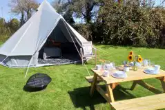 Five metre bell tents with beds and mattresses to sleep four. All essential camping equipment provided. Just bring your own bedding. Access to shared facilities nearby.