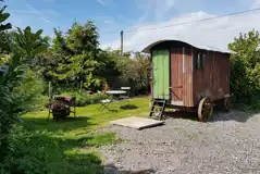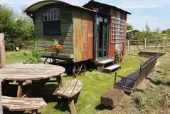 The Aunt Sally shepherd's hut includes a double bed, two smaller beds for kids, dining area, oven/grill microwave, fridge, kettle, toaster and toilet facility. Linen is provided.