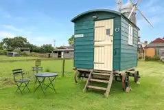 Shepherd's hut with a pull out double sofa bed, space for a child's camp bed, lights, electric, toaster, kettle and electric fridge beneath the hut. Outside table and chairs. Access to shared facilities nearby.