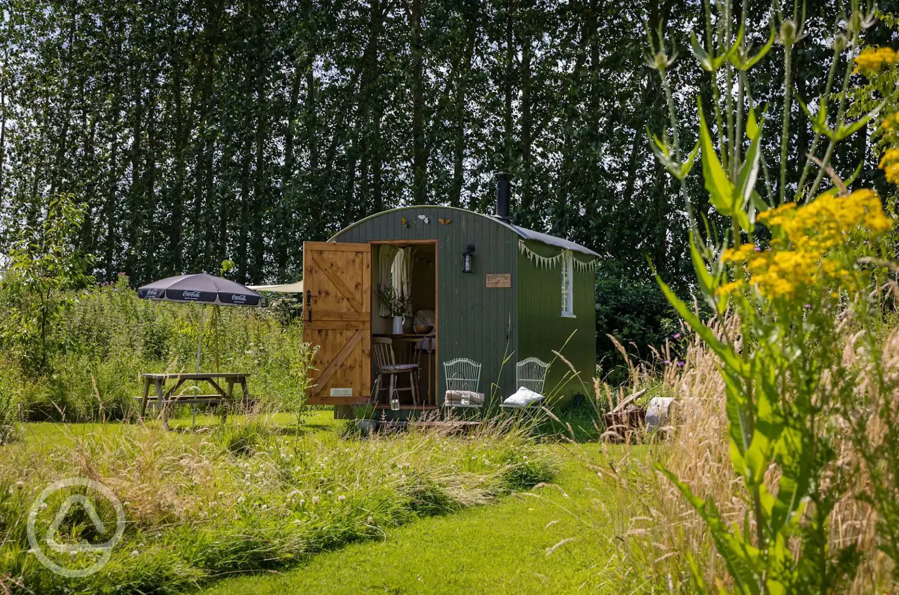 On a small meadow, overlooking a river valley. Stunning sunsets and quirky features including a converted horsebox.