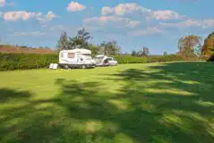 Level grass pitches with 16 amp electric hook up for tents, single axle touring caravans, motorhomes and trailer tents. There is space for an awning and car next to your pitch.
