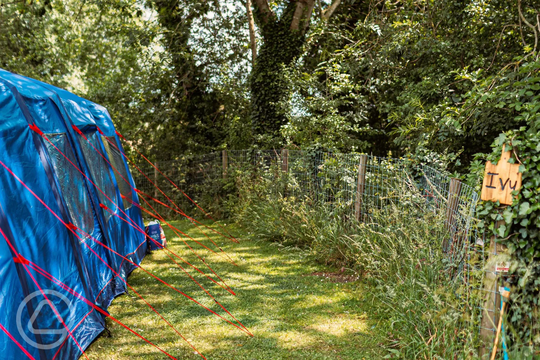 Grass 10m x 10m pitches with space for a 7m x 5m unit, plus extra space, with the option of 10 amp electric hook up. Each pitch comes with its own picnic bench. Suitable for tents and trailer tents only.