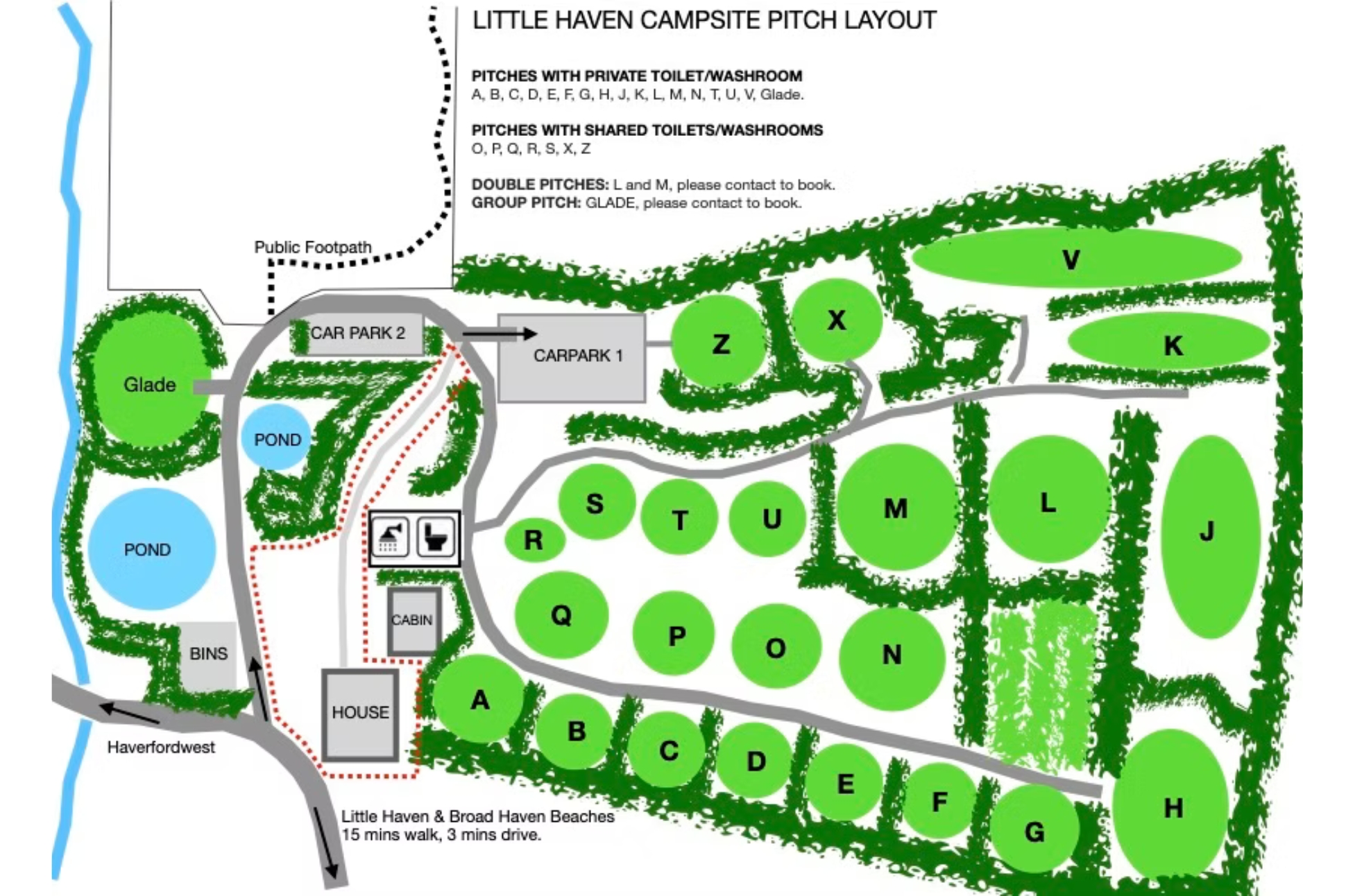 A peaceful, eco friendly, back-to-nature campsite in the Pembrokeshire Coast National Park, with private washrooms provided for 17 of the 24 pitches. Just a 15 minute stroll from the site leads you to Little Haven and Broad Haven beaches, with access to join the Pembrokeshire Coastal Path. There are spacious grass pitches for tents, campervans and roof tents, with each having its own timber picnic bench. 17 of these pitches have their own private lockable washroom with flushing toilet and sink, and a further seven pitches have the use of two shared washrooms. There are also some double pitches designed for two to three families wanting to camp together. With all pitches set within five acres of meadowland rich with wildlife, and separated by wild grasses, it's a beautiful location offering plenty of space and privacy, whilst having quality facilities for your stay. Cars are permitted on the site to set up camp, then are parked in a designated car park area, which adds to the peaceful and safe atmosphere on the site. Note that cars with roof tents and campervans are allowed on the pitches. Small campfires are allowed in provided fire bowls, free of charge, so don't forget those marshmallows! Bagged logs are available for sale onsite, too. Dogs are welcome, but must be kept on a lead and not left unattended at any time. Please note that this campsite is part of The Greener Camping Club, and so at least one member of the booking party has to be a member. Membership is £12 for the year and can be bought upon booking.