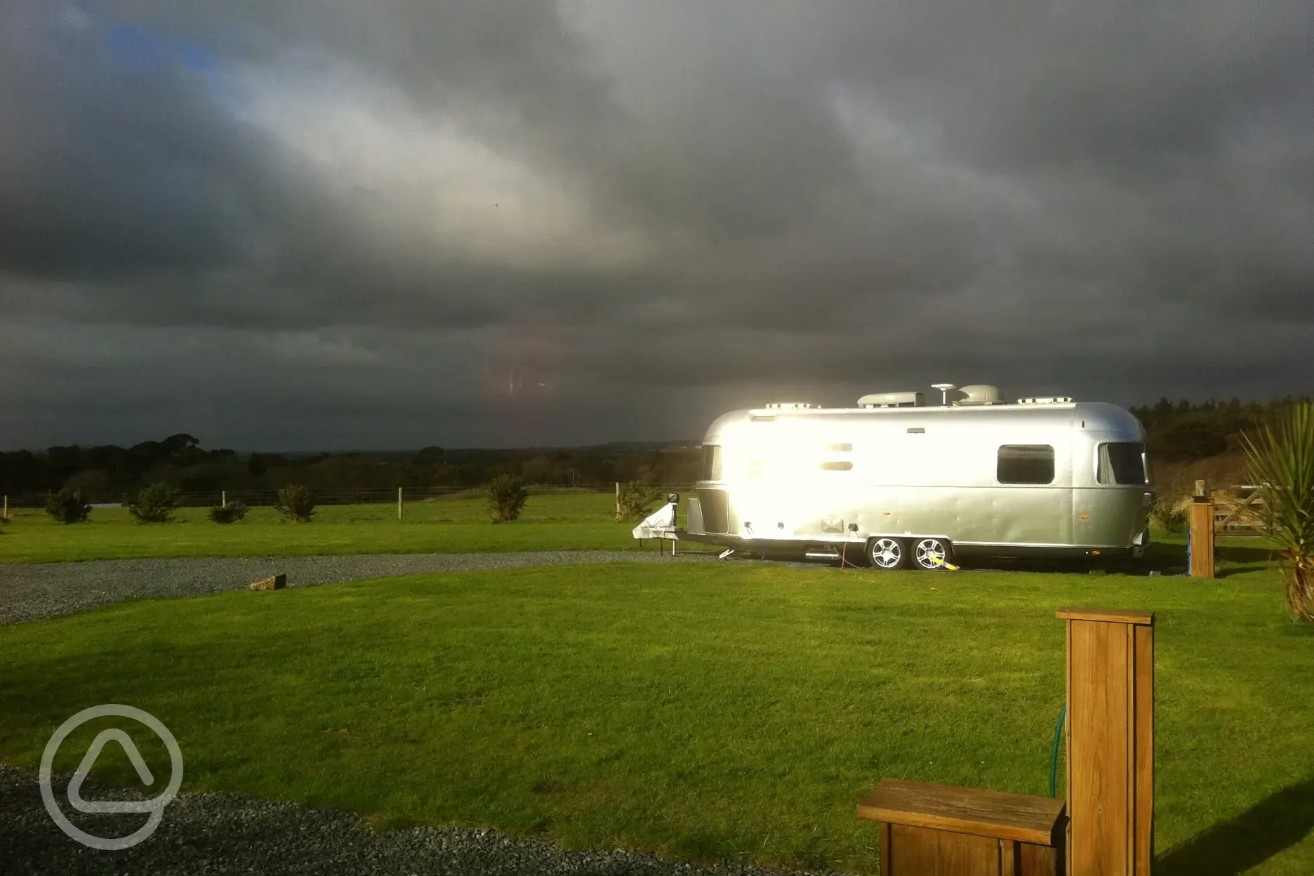 Grass spacious pitch without electric with countryside views. For caravans, campervans and motorhomes up to 14m.