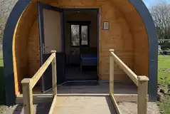 Pods with accessible doors and ramps, a double bed and single bed with mattresses provided. Bring your own bedding, airbeds or roll mats for kids, if needed. Shared facilities. Radiator supplied, pets welcome.