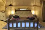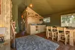 Safari tent with king size bedroom and king size cabin bed accessed by a ladder. Equipped with electric, a lounge/dining area, kitchen with a gas hob, fridge and microwave. Ensuite with loo and roll top bath. Outdoor decking with seating. Sorry, no dogs.