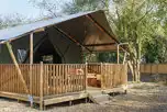 Safari tent with a king size bedrom and a three bunk bedroom with bedding. Equipped with electric, a lounge/dining area, kitchen with a gas hob, fridge and microwave. Ensuite with loo and roll top bath. Outdoor decking with seating. Sorry, no dogs.