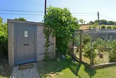 Cosy cabin sleeping two in a double bed, bedding and towels included. Well equipped kitchenette, table and TV. Outside a grassed area with bench. Shared facilities nearby.