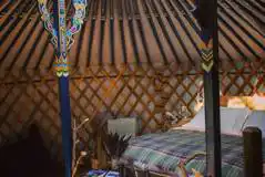 A spacious 6m bell tent with upcycled furniture and a fabulous king-size bed, sleeping two. There's also a woodburning stove and Swedish rag rugs inside.