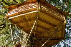 Set on a 21 metre squared platform there's a tented bedroom with a cosy stove and double bed. From the deck you can sit and enjoy the views and enjoy the feel of a stunning oak tree all around you.