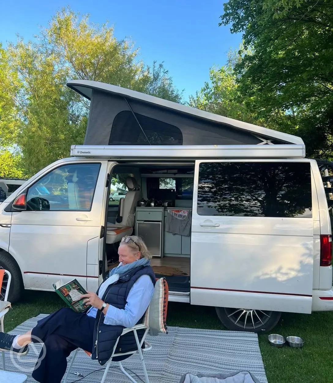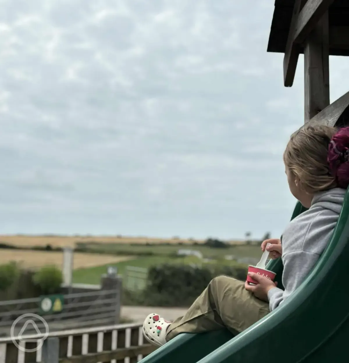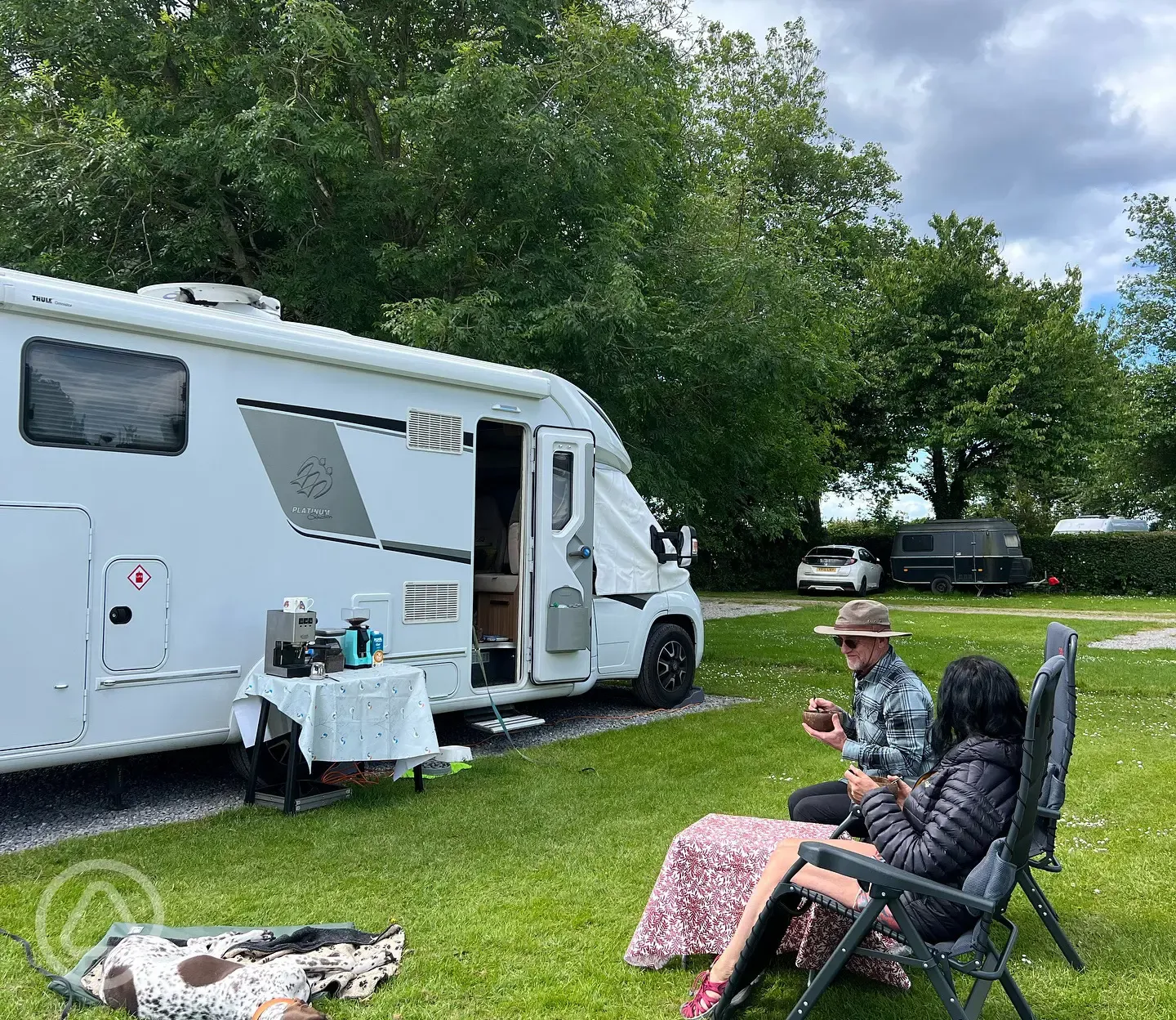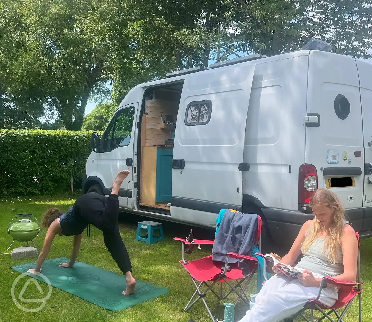 Grass pitches, with electric hook-up available for campers and caravans. Some pitches have hedges surrounding them, ideal for tents as they provide extra shelter.
