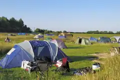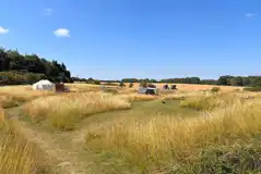 Circular pitches are mown into the long wild grass in clusters of three, with each cluster provided with a shared picnic table and fire pit. Pitches measure approximately 6m x 6m, suitable for tents only.