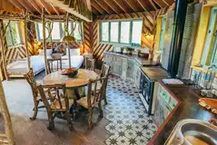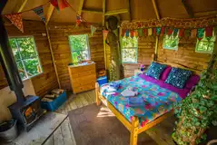 Ash Tree Temple sleeps 4 in a double bed and a bunkbed with a luxury eco ensuite. There's a kitchenette with small fridge and table and chairs. There's both central heating and a log stove for cosiness.