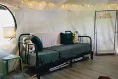 Garden canvas yurts with all you need for a luxury getaway. Inside there is double bed and day bed, fairy lights, a log stove and a solar lantern. Inside you'll have a gas hob, kettle, cool box, table and chairs. You'll need to bring your own bedding.